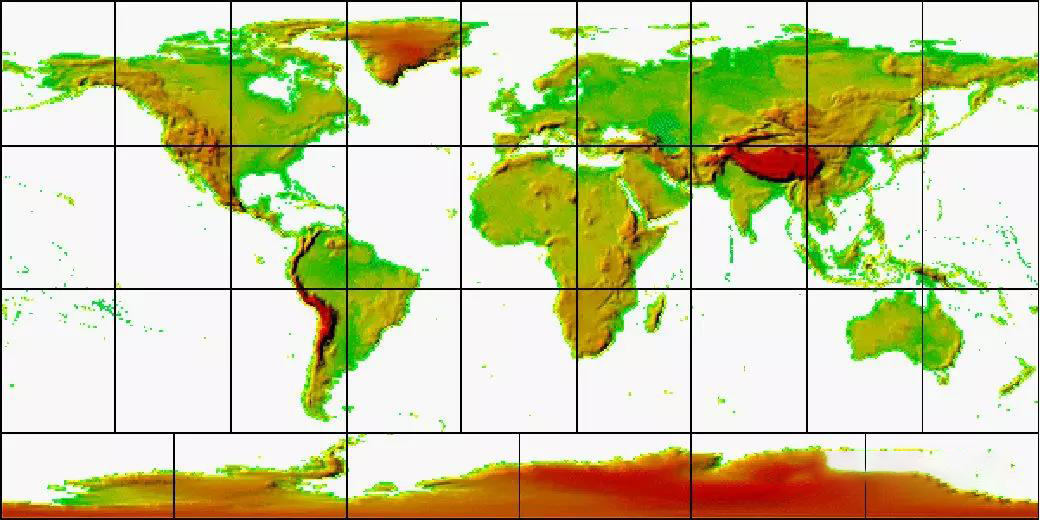為了便于數據分發(fā),GTOPO30將全球數據分為33幅,用戶(hù)可以根據研究區域分幅獲取。