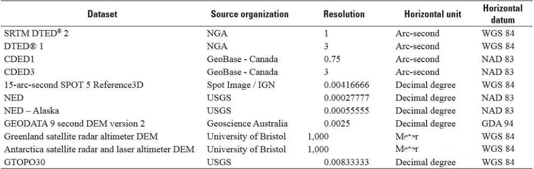 GMTED2010的數據源具有多分辨率、多基準面、多坐標系的特征,NASA和NGA在制作GMTED2010產(chǎn)品時(shí),除了采用多分辨率外,還建立了包括最小高程、最大高程、平均高程、中間高程、高程標準偏差、系統統計采樣、增強特征曲線(xiàn)的七種高程產(chǎn)品。