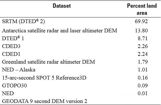 GMTED2010在GTOPO30的基礎上引入了新的高程數據源,多達11種柵格高程數據源,最主要的數據源NGA SRTM DTED2數據,約占69.92%,1弧秒分辨率,WGS84坐標系統,基于EGM96模型的正常高高程;NGA DTED1數據,約占8.7%,3弧秒分辨率,基于MSL的正常高高程;GMTED2010的數據源及其占比如下表