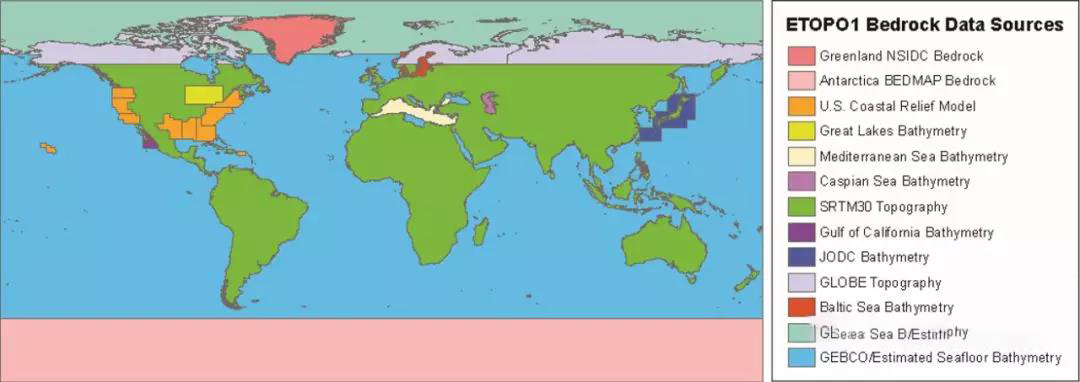 NGDC于2001年、2006年陸續發(fā)布了ETOPO2的兩個(gè)版本,提供5弧分經(jīng)緯度網(wǎng)格的陸地和海洋高程;2008年8月NGDC發(fā)布了ETOPO1版本,提供全球范圍1弧分經(jīng)緯度網(wǎng)格分辨率的陸渡和海洋高程,分為Ice Surface和Bedrock兩個(gè)版本,兩個(gè)版本差別在于處理南極洲和Greenland區域數據時(shí),Ice Surface給出的是加上冰蓋層之后的高程,Bedrock給出的是巖床的高程。ETOPO1是目前可以免費使用的唯一提供海洋高程的全球DEM數據。
