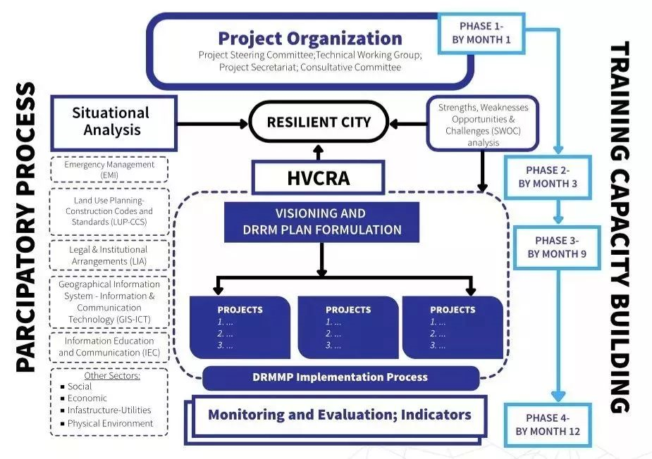 2015年,EMI(Earthquake emergency initiative)針對發(fā)展中國家發(fā)布了《Urban Resilience Master Planning》(城市韌性總體規劃)。通過(guò)實(shí)施災害風(fēng)險管理總體規劃(DRMMP)的方法為韌性城市建設提供規劃框架和實(shí)施路徑。具體實(shí)施過(guò)程分組織與準備、診斷與分析、規劃編制、實(shí)施監測和評估四個(gè)階段(圖7)。