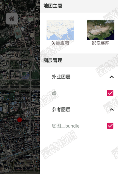 圖層管理模塊主要包含業(yè)務(wù)圖層管理和參考圖層管理,業(yè)務(wù)圖層主要包含點(diǎn)圖層的顯示開(kāi)關(guān),參考圖層可以控制原始影像數據的顯示開(kāi)關(guān)。