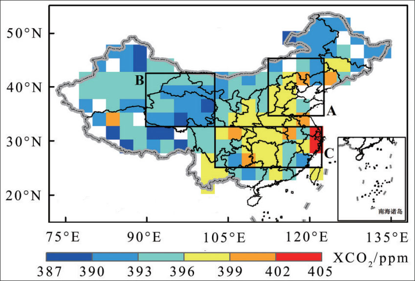 圖2 中國大氣XCO2平均濃度示意圖