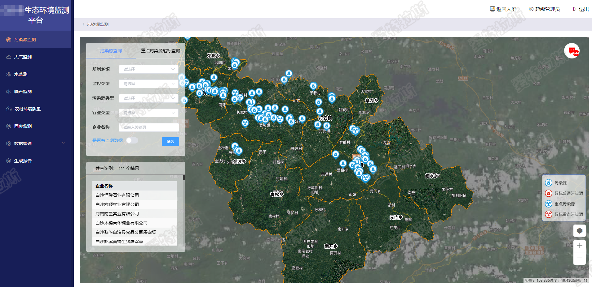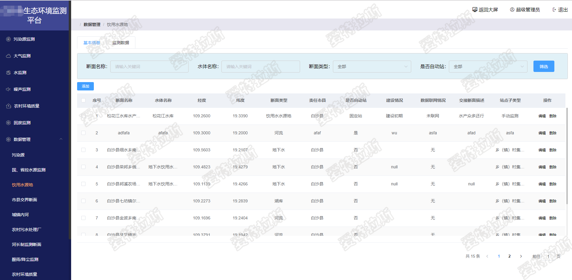 通過(guò)監測站和手工監測提供的數據實(shí)現分析統計數據管理的這么一個(gè)系統。數據管理也可以稱(chēng)為數據庫主要是對收錄的數據去進(jìn)行一個(gè)區分編輯管理,整個(gè)環(huán)境的統計查詢(xún)分析提供一份明確的數據。污染源、大氣、水、噪音、農村環(huán)境質(zhì)量、固廢六大監測通過(guò)數據管理提供的數據可以在地圖中呈現出可視化的展示,可以對其進(jìn)行查詢(xún)篩選,點(diǎn)擊地圖中的標識點(diǎn)位會(huì )出現詳情框,在詳情框里會(huì )展示出該點(diǎn)位的具體詳情等操作。 |