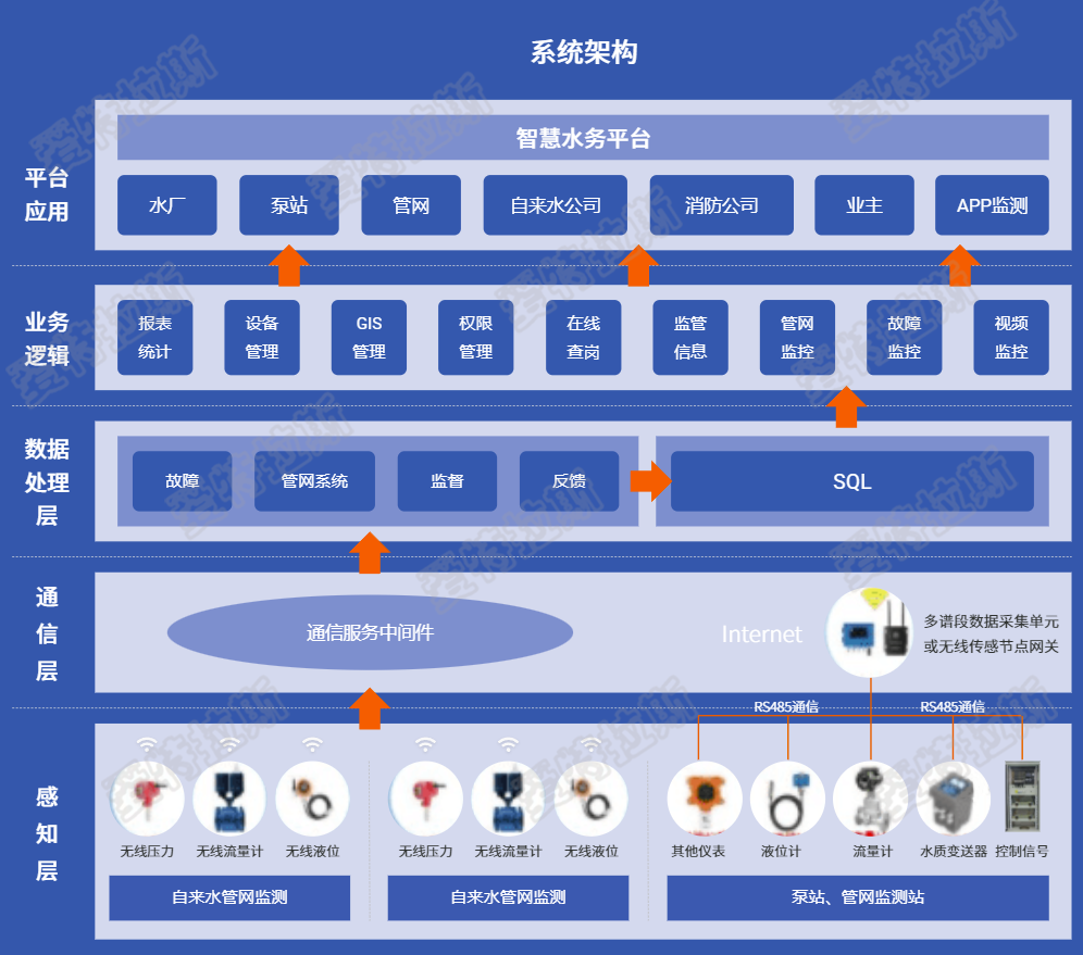 水利可視化監測系統系統通過(guò)數采儀、無(wú)線(xiàn)網(wǎng)絡(luò )、水質(zhì)水壓表、液位監測儀等在線(xiàn)監測設備實(shí)時(shí)感知城市供排水系統的運行狀態(tài),并采用可視化的方式有機整合水務(wù)管理部門(mén)與供排水設施,形成“城市水務(wù)物聯(lián)網(wǎng)”,并可將海量水務(wù)信息進(jìn)行及時(shí)分析與處理,并作出相應的處理結果輔助決策建議,以更加精細和動(dòng)態(tài)的方式管理水務(wù)系統的整個(gè)生產(chǎn)、管理和服務(wù)流程,從而達到“智慧”監測的目的。