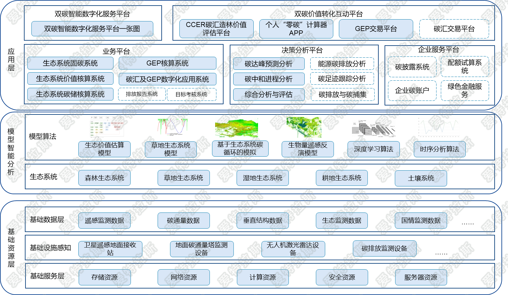(三)基于統一的時(shí)空基準和國家標準,自主國產(chǎn)化研發(fā)雙碳數字化服務(wù)平臺?;诮y一的數字時(shí)空基準,形成集數據集成、模型核算、查詢(xún)統計、對比分析為一體的可視化管理展示平臺,形成碳匯監測“一張圖”成果,CCER評價(jià)估值服務(wù)及碳交易流轉“一平臺”,構建“天空地”三位一體生態(tài)環(huán)境碳匯數字治理服務(wù)體系。