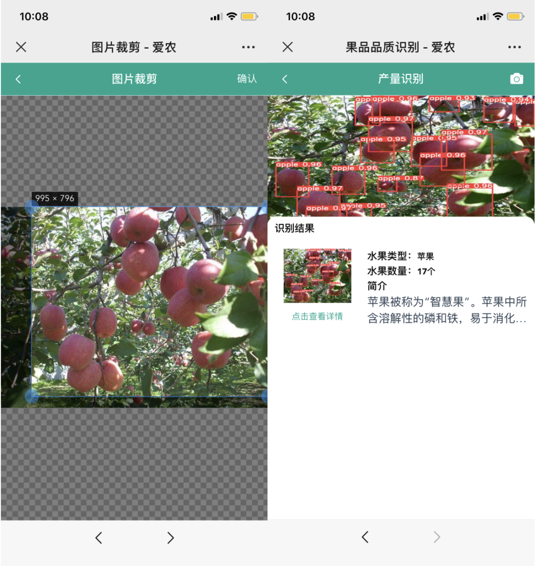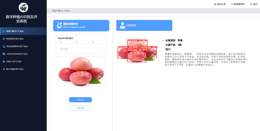 該項目是2022年開(kāi)發(fā)的數字種植業(yè)數據服務(wù)平臺?;趷?ài)特拉斯深度學(xué)習算法,系統建設了AI識別及評估子系統、果樹(shù)病害識別子系統、果品品質(zhì)等級識別子系統、AI樣本庫及知識庫子系統等多個(gè)果樹(shù)、果園AI識別識別系統,解決了果園產(chǎn)量預估困難、果樹(shù)病蟲(chóng)害監測識別難的問(wèn)題。