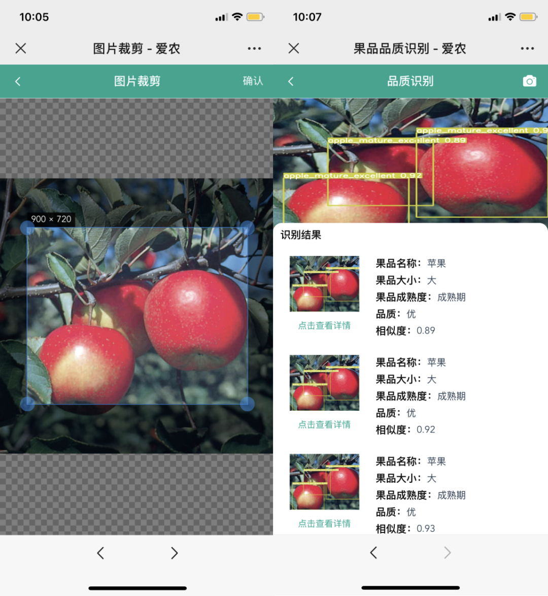 “愛(ài)農2.0”產(chǎn)品是基于人工智能圖像技術(shù)與大數據技術(shù)的果品品質(zhì)識別、果樹(shù)產(chǎn)量識別、農作物病蟲(chóng)害識別、植物識別的多方位應用軟件。集“識別功能+專(zhuān)家庫功能+定位功能+統計功能+地圖功能+科普功能”于一身;具備豐富的樣本數據類(lèi)型包含植物、病害、蟲(chóng)害、果品、果品新鮮度等圖片樣本數據20000種;識別精度90%以上;專(zhuān)家庫來(lái)源于各大高校相關(guān)領(lǐng)域的教授、相關(guān)領(lǐng)域的專(zhuān)家,專(zhuān)家數量在100位左右。隨著(zhù)用戶(hù)的使用和參與,AI智能識別產(chǎn)品將逐步發(fā)展、完善,成為農業(yè)領(lǐng)域的好幫手。